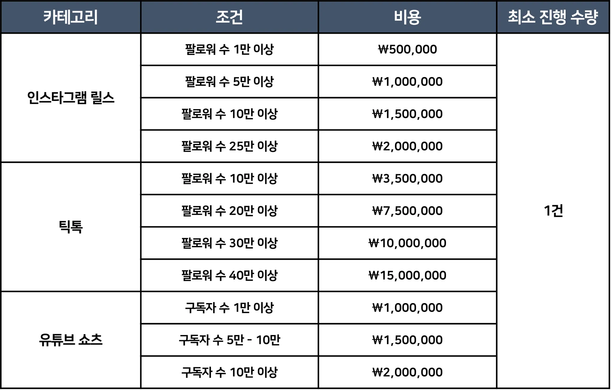 쇼트폼 (릴스 · 틱톡  · 쇼츠) 광고 단가표 입니다.