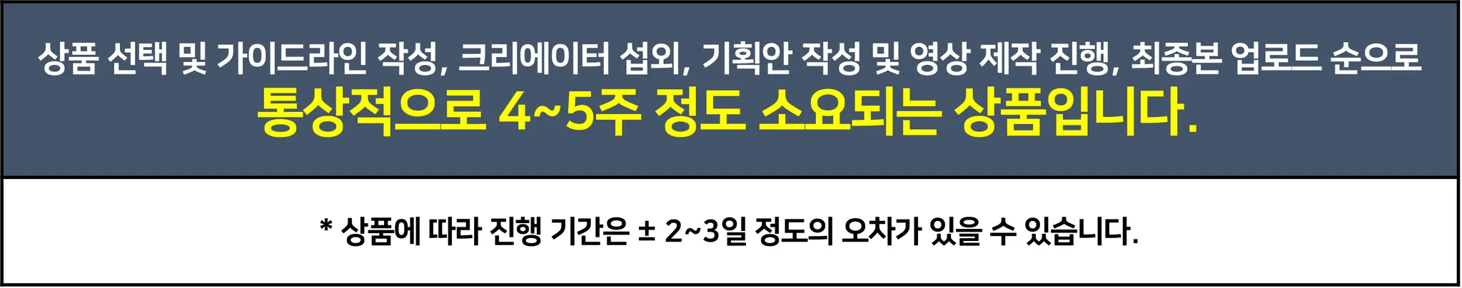 4. 일반적으로 촬영 기획부터 업로드까지 약 3~4주 정도 소요 됩니다. (사전 일정조율 必)