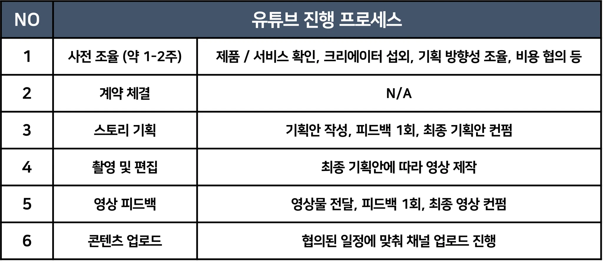 ⓐ 사전 조율 (1~2주) : 제품/서비스 확인 , 크리에이터 섭외 , 기획 방향성 조율 , 비용 협의 등