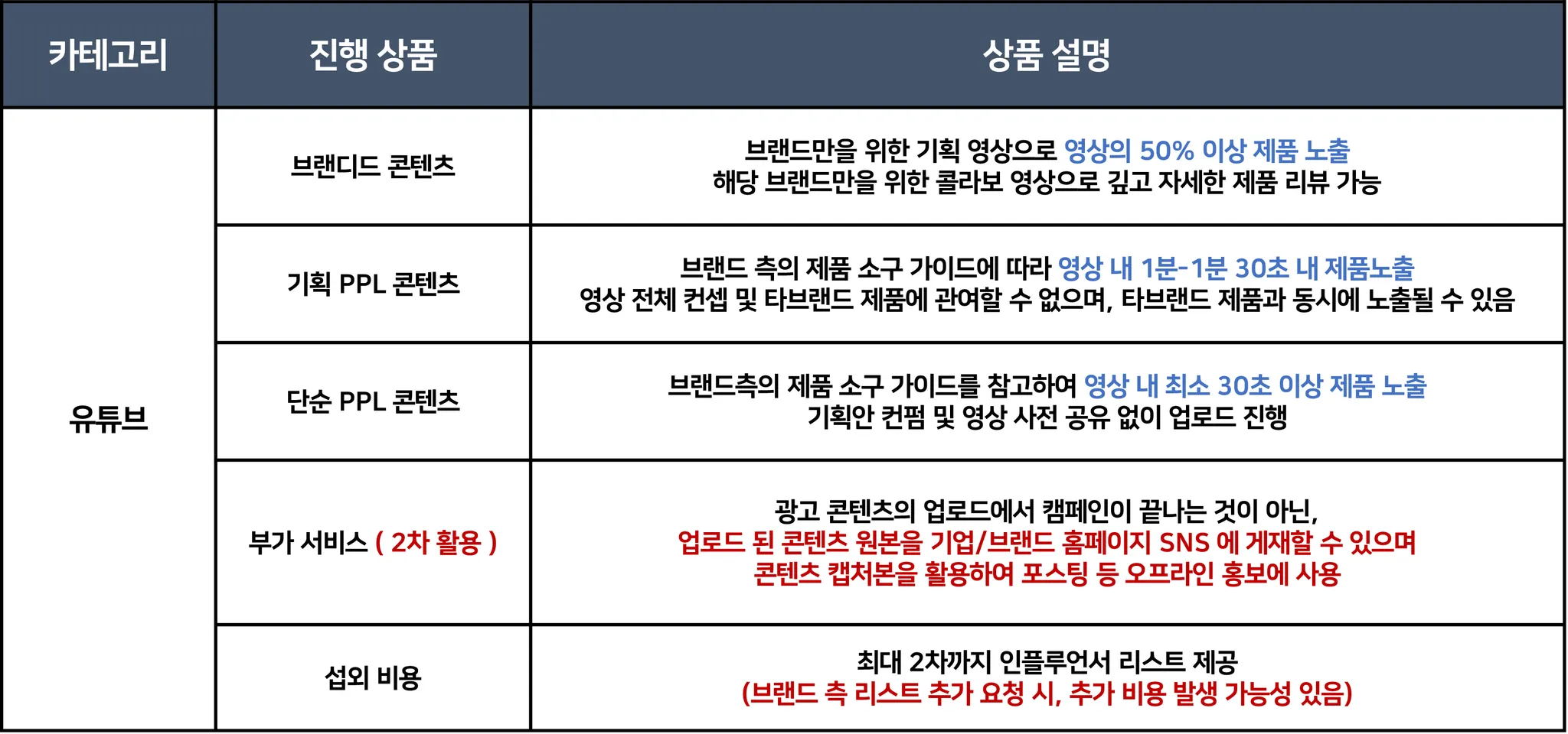 - 모집 조건 전달 및 조율 ( 성별 / 구독자 수 기준 / 카테고리 / 영상 컨셉 (브랜디드 or PPL)