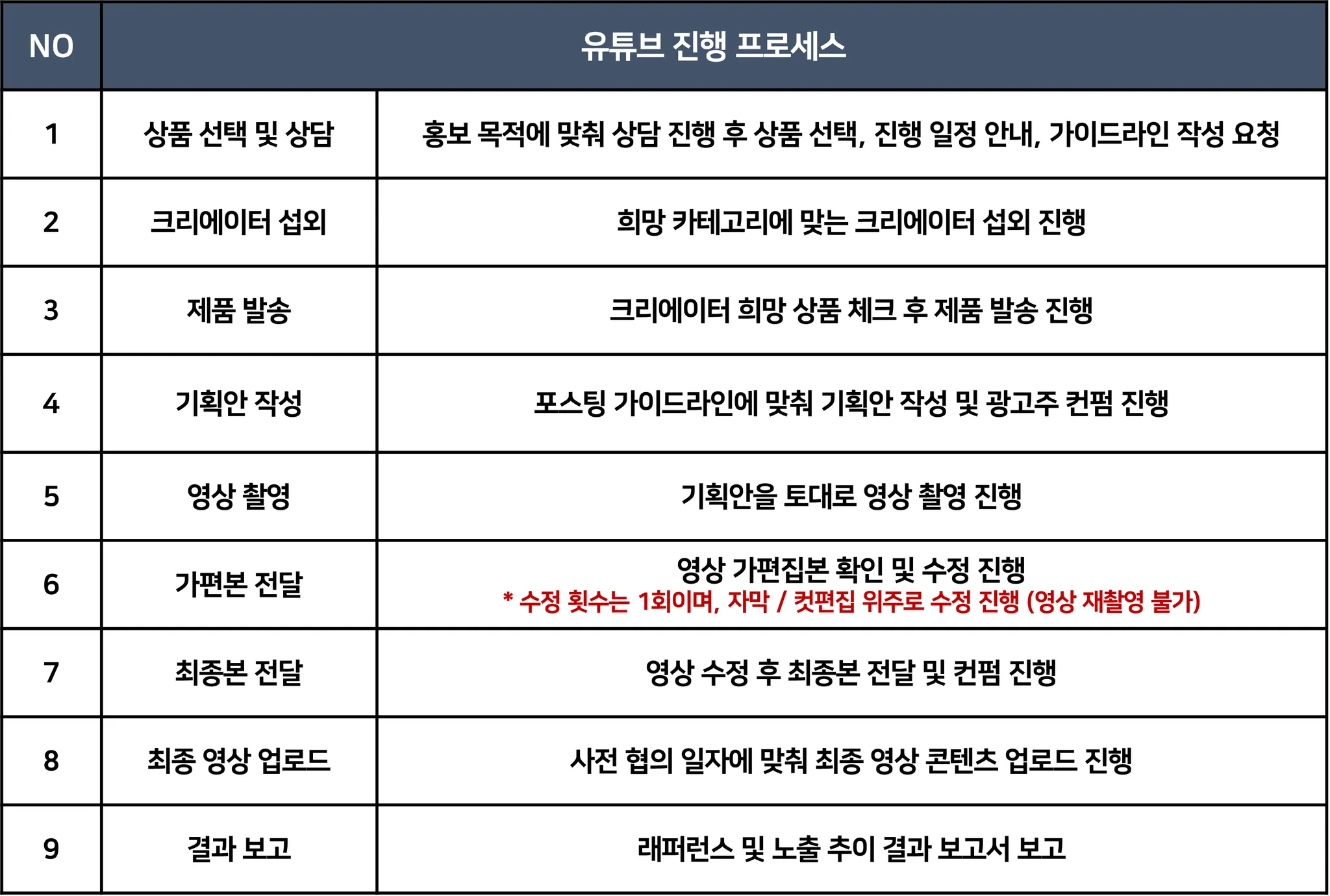 * 브랜드측 피드백은 최대 1~2회 가능 (자막, 컷편집 가능/재촬영 불가)